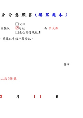 身 分 意 願 書 (填 寫 範 本 ) □ 父姓 定自願從 母姓 為 王大海 □ 原住民傳統姓名 ,並據以申報戶籍登記。 簽章 路二段 306 號 3 月 11 日