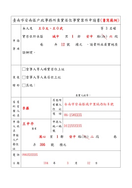 臺南市安南區戶政事務所查實居住事實案件申請書(書寫範例)