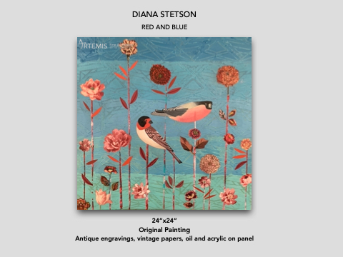 DIANA STETSON RED AND BLUE 24”x24” Original Painting Antique engravings, vintage papers, oil and acrylic on panel