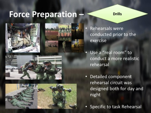 Force Preparation – Drills • Rehearsals were conducted prior to the exercise • Use a “real room” to conduct a more realistic rehearsal • Detailed component rehearsal circuit was designed both for day and night • Specific to task Rehearsal
