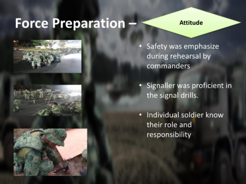 Force Preparation – Attitude • Safety was emphasize during rehearsal by commanders • Signaller was proficient in the signal drills. • Individual soldier know their role and responsibility