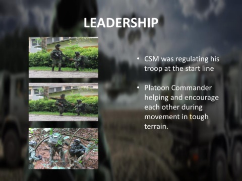 LEADERSHIP • CSM was regulating his troop at the start line • Platoon Commander helping and encourage each other during movement in tough terrain.
