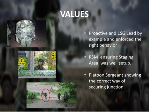 VALUES • Proactive and 1SG Lead by example and enforced the right behavior • RSM ensuring Staging Area was well setup. • Platoon Sergeant showing the correct way of securing junction.