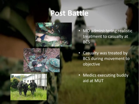 Post Battle • MO administering realistic treatment to casualty at BCS • Casualty was treated by BCS during movement to objective • Medics executing buddy aid at MUT