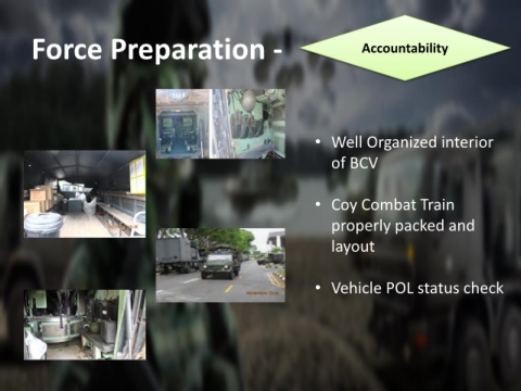 Force Preparation - Accountability • Well Organized interior of BCV • Coy Combat Train properly packed and layout • Vehicle POL status check