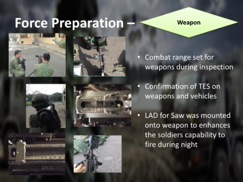 Force Preparation – Weapon • Combat range set for weapons during inspection • Confirmation of TES on weapons and vehicles • LAD for Saw was mounted onto weapon to enhances the soldiers capability to fire during night