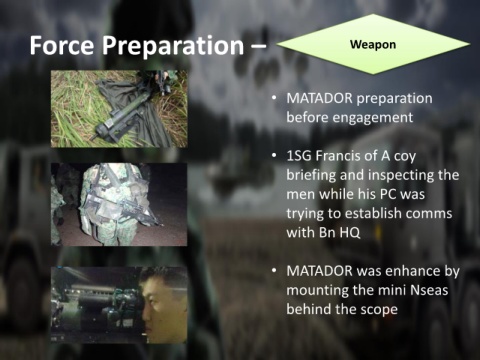 Force Preparation – Weapon • MATADOR preparation before engagement • 1SG Francis of A coy briefing and inspecting the men while his PC was trying to establish comms with Bn HQ • MATADOR was enhance by mounting the mini Nseas behind the scope