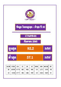 ข้อมูล โหลดสูงสุด - ต ่ำสุด ปี 60 CTA6YB-01 กันยำยน 2560 สูงสุด 92.2 MW ต ่ำสุด 57.1 MW DATE TIME KV IA IB IC UN% MW MVAR PF 23 03.00 117.9 287 305 301 5.8 -57.1 -19.8 95 14 18.30 117.7 482 508 497 5.0 -92.2 -40.9 91