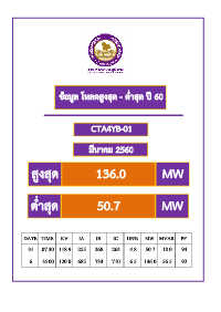 ข้อมูล โหลดสูงสุด - ต ่ำสุด ปี 60 CTA4YB-01 มีนำคม 2560 สูงสุด 136.0 MW ต ่ำสุด 50.7 MW DATE TIME KV IA IB IC UN% MW MVAR PF 31 07.30 118.9 255 268 263 4.8 50.7 18.0 94 6 16.00 120.0 685 733 710 6.5 136.0 56.5 92