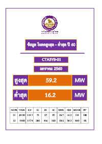 ข้อมูล โหลดสูงสุด - ต ่ำสุด ปี 60 CTA3YB-01 มกรำคม 2560 สูงสุด 59.2 MW ต ่ำสุด 16.2 MW DATE TIME KV IA IB IC UN% MW MVAR PF 31 03.30 118.7 73 87 87 16.7 16.2 0.0 100 12 19.00 117.9 286 316 320 10.6 59.2 20.0 95