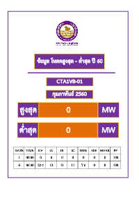 ข้อมูล โหลดสูงสุด - ต ่ำสุด ปี 60 CTA1VB-01 กุมภำพันธ์ 2560 สูงสุด 0 MW ต ่ำสุด 0 MW DATE TIME KV IA IB IC UN% MW MVAR PF 1 00.00 0 0 0 0 0 0 0 100 6 06.30 22.4 12 11 11 7.6 0 0 100