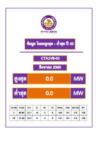 ข้อมูล โหลดสูงสุด - ต ่ำสุด ปี 60 CTA1VB-01 สิงหำคม 2560 สูงสุด 0.0 MW ต ่ำสุด 0.0 MW DATE TIME KV IA IB IC UN% MW MVAR PF 3 00.00 22.5 10 0 0 100 0.0 0.0 100 30 23.30 22.8 0 0 0 0.0 0.0 0.0 100