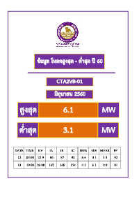 ข้อมูล โหลดสูงสุด - ต ่ำสุด ปี 60 CTA2VB-01 มิถุนำยน 2560 สูงสุด 6.1 MW ต ่ำสุด 3.1 MW DATE TIME KV IA IB IC UN% MW MVAR PF 12 04.00 21.9 86 87 92 6.4 3.1 1.3 92 13 19.00 23.00 167 168 174 4.1 6.1 2.8 91