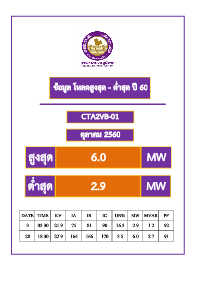ข้อมูล โหลดสูงสุด - ต ่ำสุด ปี 60 CTA2VB-01 ตุลำคม 2560 สูงสุด 6.0 MW ต ่ำสุด 2.9 MW DATE TIME KV IA IB IC UN% MW MVAR PF 3 03.30 21.9 75 81 90 16.3 2.9 1.2 92 28 18.30 22.9 164 166 170 3.5 6.0 2.7 91