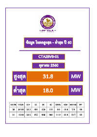 ข้อมูล โหลดสูงสุด - ต ่ำสุด ปี 60 CTA2BVB-01 ตุลำคม 2560 สูงสุด 31.8 MW ต ่ำสุด 18.0 MW DATE TIME KV IA IB IC UN% MW MVAR PF 20 04.30 22.2 481 523 513 8.0 18.0 7.0 93 31 18.30 22.5 875 900 903 3.14 31.8 13.7 92