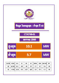 ข้อมูล โหลดสูงสุด - ต ่ำสุด ปี 60 CTA7VB-01 มกรำคม 2560 สูงสุด 10.1 MW ต ่ำสุด 3.7 MW DATE TIME KV IA IB IC UN% MW MVAR PF 30 04.00 22.1 103 99 97 5.7 3.7 0.6 99 18 13.00 22.8 271 277 267 3.0 10.1 3.5 94