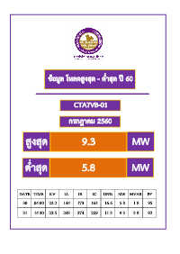 ข้อมูล โหลดสูงสุด - ต ่ำสุด ปี 60 CTA7VB-01 กรกฎำคม 2560 สูงสุด 9.3 MW ต ่ำสุด 5.8 MW DATE TIME KV IA IB IC UN% MW MVAR PF 30 04.00 22.2 144 173 163 16.6 5.8 1.8 95 31 14.30 22.5 243 274 259 11.3 9.3 3.8 92