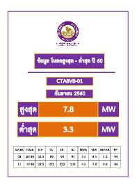 ข้อมูล โหลดสูงสุด - ต ่ำสุด ปี 60 CTA8VB-01 กันยำยน 2560 สูงสุด 7.8 MW ต ่ำสุด 3.3 MW DATE TIME KV IA IB IC UN% MW MVAR PF 23 04.30 22.3 89 94 91 5.5 3.3 1.2 94 11 14.30 22.5 212 222 213 4.5 7.8 3.0 93