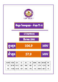 ข้อมูล โหลดสูงสุด - ต ่ำสุด ปี 61 CTA6YB-01 มีนำคม 2561 สูงสุด 104.9 MW ต ่ำสุด 57.9 MW DATE TIME KV IA IB IC UN% MW MVAR PF 16 01.30 118.1 285 304 303 6.1 -57.9 -17.0 96 26 11.00 116.4 557 585 572 4.9 -104.9 -46.7 91