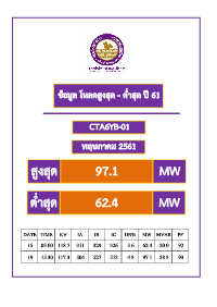 ข้อมูล โหลดสูงสุด - ต ่ำสุด ปี 61 CTA6YB-01 พฤษภำคม 2561 สูงสุด 97.1 MW ต ่ำสุด 62.4 MW DATE TIME KV IA IB IC UN% MW MVAR PF 15 03.00 118.7 311 329 326 5.6 62.4 20.0 92 19 15.30 117.3 504 527 513 4.3 97.1 38.3 93