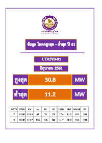 ข้อมูล โหลดสูงสุด - ต ่ำสุด ปี 61 CTA3YB-01 มิถุนำยน 2561 สูงสุด 30.8 MW ต ่ำสุด 11.2 MW DATE TIME KV IA IB IC UN% MW MVAR PF 7 01.00 118.5 61 73 73 17.4 11.2 0.0 100 3 18.30 117.7 146 156 165 11.7 30.8 0.0 100