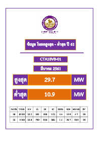 ข้อมูล โหลดสูงสุด - ต ่ำสุด ปี 61 CTA1BVB-01 มีนำคม 2561 สูงสุด 29.7 MW ต ่ำสุด 10.9 MW DATE TIME KV IA IB IC UN% MW MVAR PF 30 03.00 22.2 301 303 312 3.4 10.9 4.7 93 25 14.00 22.8 799 810 802 1.5 29.7 10.8 94
