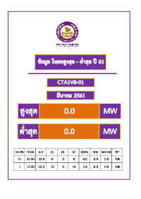 ข้อมูล โหลดสูงสุด - ต ่ำสุด ปี 61 CTA1VB-01 มีนำคม 2561 สูงสุด 0.0 MW ต ่ำสุด 0.0 MW DATE TIME KV IA IB IC UN% MW MVAR PF 31 23.30 22.8 0 0 0 0.0 0.0 0.0 100 1 15.30 22.4 10 9 10 5.9 0.0 0.0 100