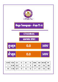 ข้อมูล โหลดสูงสุด - ต ่ำสุด ปี 61 CTA1VB-01 เมษำยน 2561 สูงสุด 0.0 MW ต ่ำสุด 0.0 MW DATE TIME KV IA IB IC UN% MW MVAR PF 1 23.30 22.6 0 0 0 100 0.0 0.0 100 30 15.30 22.7 13 12 12 5.7 0.0 0.0 100