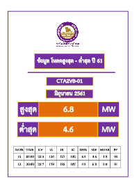ข้อมูล โหลดสูงสุด - ต ่ำสุด ปี 61 CTA2VB-01 มิถุนำยน 2561 สูงสุด 6.8 MW ต ่ำสุด 4.6 MW DATE TIME KV IA IB IC UN% MW MVAR PF 15 03.00 22.3 124 127 132 6.3 4.6 1.8 93 12 20.00 22.7 179 185 187 4.3 6.8 3.0 91