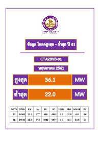ข้อมูล โหลดสูงสุด - ต ่ำสุด ปี 61 CTA2BVB-01 พฤษภำคม 2561 สูงสุด 36.1 MW ต ่ำสุด 22.0 MW DATE TIME KV IA IB IC UN% MW MVAR PF 12 04.00 22.1 577 610 606 5.5 22.0 6.0 96 10 09.30 22.4 974 1000 997 2.5 36.1 12.8 94