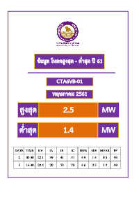 ข้อมูล โหลดสูงสุด - ต ่ำสุด ปี 61 CTA6VB-01 พฤษภำคม 2561 สูงสุด 2.5 MW ต ่ำสุด 1.4 MW DATE TIME KV IA IB IC UN% MW MVAR PF 2 03.30 22.1 39 41 41 4.9 1.4 0.5 93 5 14.30 22.4 70 73 73 4.6 2.5 1.2 89