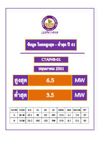 ข้อมูล โหลดสูงสุด - ต ่ำสุด ปี 61 CTA9VB-01 พฤษภำคม 2561 สูงสุด 6.5 MW ต ่ำสุด 3.5 MW DATE TIME KV IA IB IC UN% MW MVAR PF 2 03.30 22.1 99 88 101 14.2 3.5 1.0 97 9 19.00 22.5 188 162 190 14.8 6.5 2.5 93