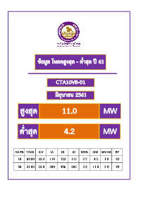 ข้อมูล โหลดสูงสุด - ต ่ำสุด ปี 61 CTA10VB-01 มิถุนำยน 2561 สูงสุด 11.0 MW ต ่ำสุด 4.2 MW DATE TIME KV IA IB IC UN% MW MVAR PF 10 08.00 22.4 119 122 115 5.7 4.2 1.8 92 30 21.00 22.8 290 306 295 5.2 11.0 3.8 94