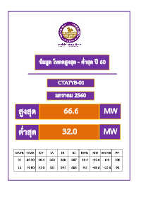 ข้อมูล โหลดสูงสุด - ต ่ำสุด ปี 60 CTA7YB-01 มกรำคม 2560 สูงสุด 66.6 MW ต ่ำสุด 32.0 MW DATE TIME KV IA IB IC UN% MW MVAR PF 31 03.30 30.4 258 280 287 10.4 -32.0 0.0 100 15 19.00 31.0 551 591 608 9.5 -66.6 -21.6 95