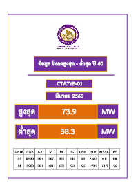 ข้อมูล โหลดสูงสุด - ต ่ำสุด ปี 60 CTA7YB-01 มีนำคม 2560 สูงสุด 73.9 MW ต ่ำสุด 38.3 MW DATE TIME KV IA IB IC UN% MW MVAR PF 31 03.30 30.9 307 331 335 8.3 -38.3 0.0 100 14 16.00 30.8 621 651 664 6.5 -73.9 -21.7 96