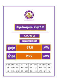 ข้อมูล โหลดสูงสุด - ต ่ำสุด ปี 60 CTA7YB-01 พฤษภำคม 2560 สูงสุด 67.0 MW ต ่ำสุด 23.9 MW DATE TIME KV IA IB IC UN% MW MVAR PF 29 13.30 30.6 202 210 213 5.4 -23.9 0.0 98 30 19.00 29.8 580 614 632 8.2 -67.0 -20.0 96