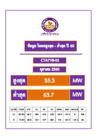 ข้อมูล โหลดสูงสุด - ต ่ำสุด ปี 60 CTA7YB-01 ตุลำคม 2560 สูงสุด 35.3 MW ต ่ำสุด 63.7 MW DATE TIME KV IA IB IC UN% MW MVAR PF 31 02.00 30.2 288 312 320 10.0 -35.3 0 100 9 18.30 30.0 554 577 604 9.9 -63.7 -19.5 96
