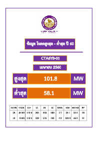 ข้อมูล โหลดสูงสุด - ต ่ำสุด ปี 60 CTA6YB-01 เมษำยน 2560 สูงสุด 101.8 MW ต ่ำสุด 58.1 MW DATE TIME KV IA IB IC UN% MW MVAR PF 29 04.00 119.3 293 310 309 5.7 58.1 23.3 93 19 10.00 119.5 529 555 541 4.8 101.8 46.3 91