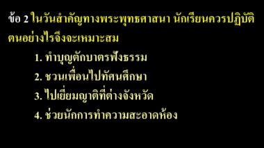 ข้อ 2 ในวันส าคัญทางพระพุทธศาสนา นักเรียนควรปฏิบัติ ตนอย่างไรจึงจะเหมาะสม 1. ท าบุญตักบาตรฟังธรรม 2. ชวนเพื่อนไปทัศนศึกษา 3. ไปเยี่ยมญาติที่ต่างจังหวัด 4. ช่วยนักการท าความสะอาดห้อง