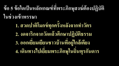 ข้อ 5 ข้อใดเป็นหลักเกณฑ์ที่พระภิกษุสงฆ์ต้องปฏิบัติ ในช่วงเข้าพรรษา 1. สวดปาติโมกข์ทุกครั้งหลังจากท าวัตร 2. งดจาริกจากวัดแล้วศึกษาปฏิบัติธรรม 3. ออกเยี่ยมเยียนชาวบ้านที่อยู่ใกล้เคียง 4. เดินทางไปเยี่ยมพระภิกษุในถิ่นทุรกันดาร