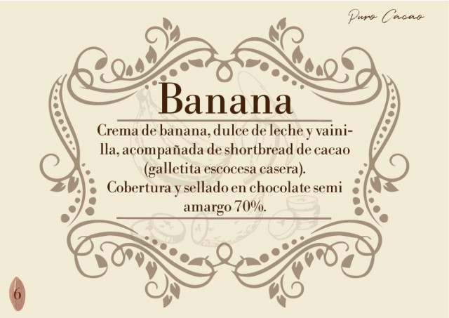Puro Cacao Banana Crema de banana, dulce de leche y vaini- lla, acompañada de shortbread de cacao (galletita escocesa casera). Cobertura y sellado en chocolate semi amargo 70%. 6