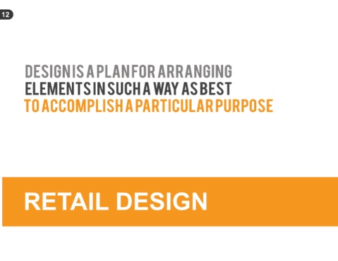 12 Design is a plan for arranging elements in such a way as best to accomplish a particular purpose RETAIL DESIGN