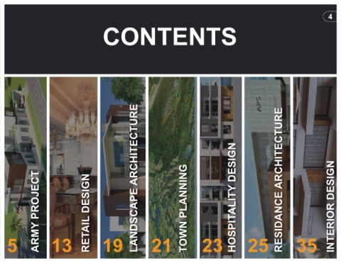 4 CONTENTS 5 ARMY PROJECT 13 RETAIL DESIGN 19 LANDSCAPE ARCHITECTURE 21 TOWN PLANNING 23 HOSPITALITY DESIGN 25 RESIDANCE ARCHITECTURE 35 INTERIOR DESIGN