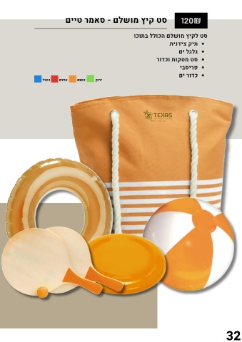 120₪סט קיץ מושלם -סאמר טיים אדום כחול כתום ירוק סט לקיץ מושלם הכולל בתוכו תיק צידנית גלגל ים סט מטקות וכדור פריסבי כדור ים 32