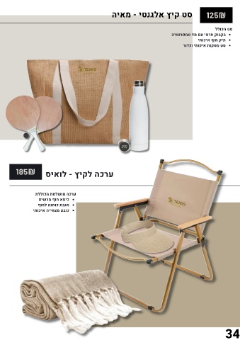 125₪סט קיץ אלגנטי -מאיה סט הכולל בקבוק תרמי עם מד טמפרטורה תיק חוף איכותי סט מטקות איכותי וכדור ערכה לקיץ -לואיס 185₪ ערכה מושלמת הכוללת כיסא חוף מרשים מגבת כותנה לחוף כובע מצחייה איכותי 34