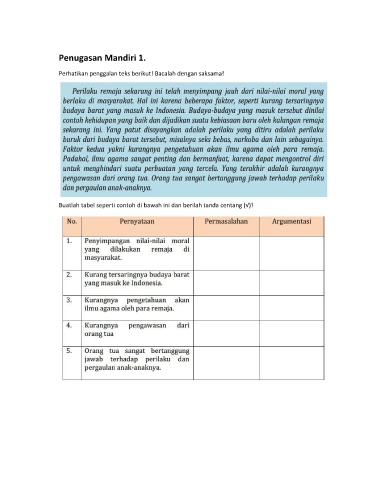 Penugasan Mandiri 1. Perhatikan penggalan teks berikut! Bacalah dengan saksama! Buatlah tabel seperti contoh di bawah ini dan berilah tanda centang (√)!