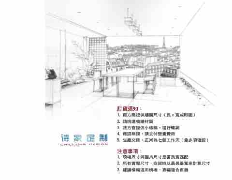訂貨須知: 1. 買方需提供牆面尺寸(長 x 寬或附圖) 2. 請挑選噴繪材質 3. 我方會提供小樣稿,進行確認 4. 確認無誤,請支付壁畫費用 5. 生產交貨,正常為七個工作天(量多須確認) 注意事項: 1. 現場尺寸與圖片尺寸是否長寬匹配 2. 所有實際尺寸,交貨時以最長最寬來計算尺寸 3. 建議橫幅適用橫墻,直幅適合直牆
