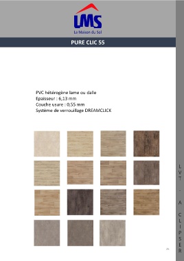 PURE CLIC 55 PVC hétérogène lame ou dalle Epaisseur : 6,13 mm Couche usure : 0,55 mm Système de verrouillage DREAMCLICK L V T - A C L I P S E 25 R