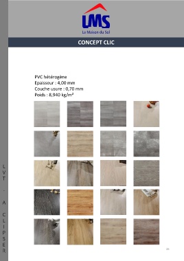 CONCEPT CLIC PVC hétérogène Epaisseur : 4,00 mm Couche usure : 0,70 mm Poids : 8,940 kg/m² L V T - A C L I P S E R 26