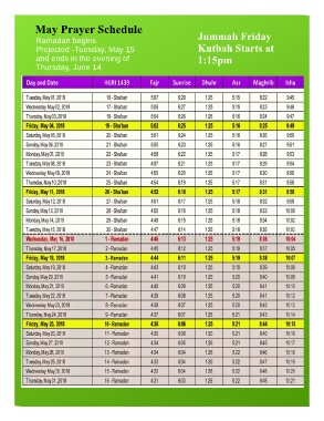 May Prayer Schedule Ramadan begins Jummah Friday Projected -Tuesday, May 15 Kutbah Starts at and ends in the evening of 1:15pm Thursday, June 14